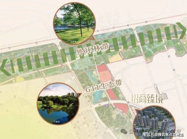 招商臻境优享一横两纵约456公顷城央公园绿廊。