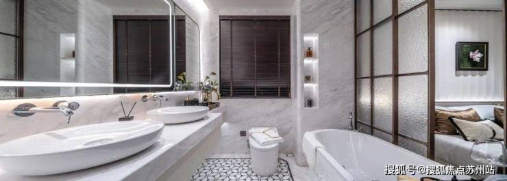 除了收纳和精装外,整个户型还设计了昂贵石材用于点缀,比如: 玄关中间置物区的透光石材、 大面的岩板 和局部 大理石 的结合的电视背景墙、卫生间烟雨江南的石材台面...