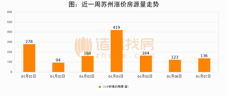 根据诸葛找房数据显示,苏州24小时涨价房源量为136套,较04月06日增加13套,环比上涨10.6%。与此同时,涨价房源占比小幅扩大,业主信心有所提升。