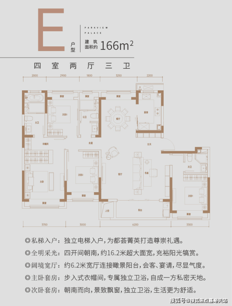 建面约165㎡奢境户型,南向四开间面宽可达约16.2m,约6.2米宽厅连接宽幕阳台,突破性尺度设计,带来通透的全景视野,一眼望向城市自然与繁华,居住于此,大平层的尊崇奢居体验油然而生.