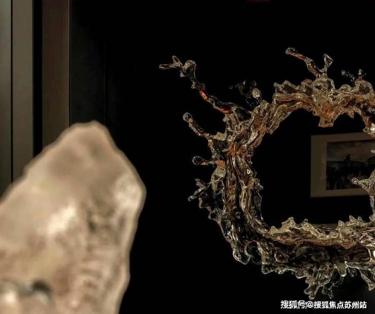 挑高金属雨棚采用极细边,中间凿壁采用透光奢石,搭配极具现代主义的雕塑彰显小区档次,背景墙面采用维多利亚黑大理石,奢华且低调。