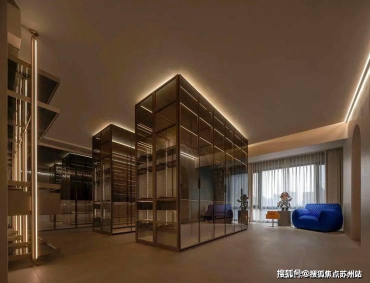 卧房包含大规模更衣间,利用琥珀玻璃组合深色材料,编织潮流轻奢的质感。且通过精致的日常装扮,赋予舒心的日常仪式。