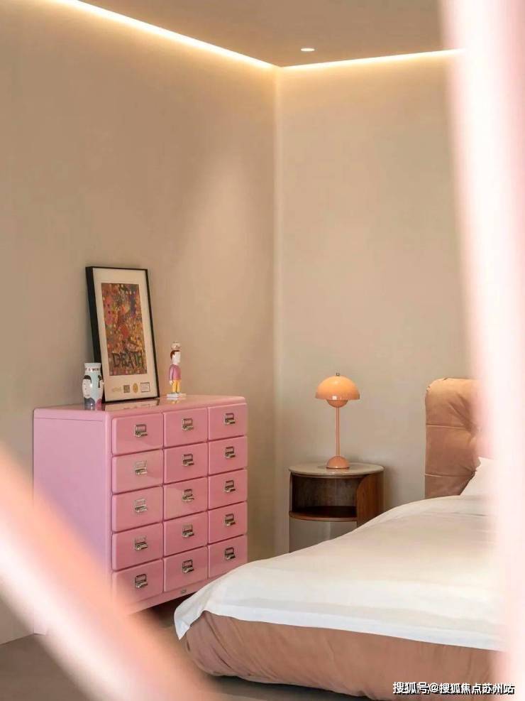 粉色与复古元素对撞,铺垫一种岁月维度,在活泼型家具和艺术画组合下,形成轻奢的日常质感。