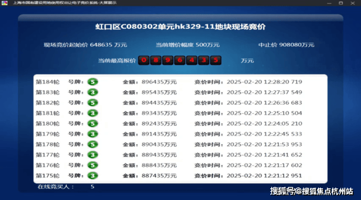 2025年2月,今年第一批次土拍中,经过184轮竞价,金茂&庆隆联合体以总价896435万元竞得虹口C080302单元hk329-11地块,溢价率38.2%,折合楼板价117474元/㎡,装修标准不小于4000元/㎡.