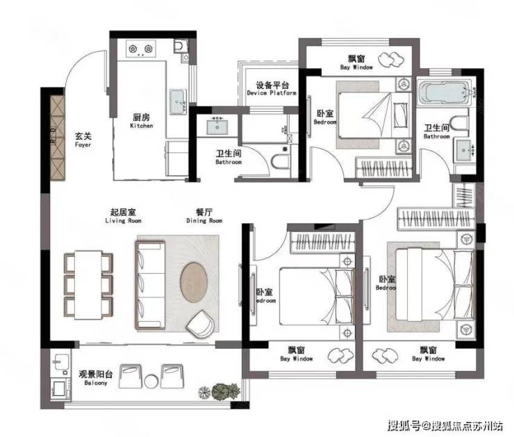 也是3房2卫,南向客厅+餐厅的横厅设计,双卧朝南,整体设计也比较合理。客卫部分空间小了点,不过也做了干湿分离!每个房间也都做了飘窗,对室内空间有个延伸!