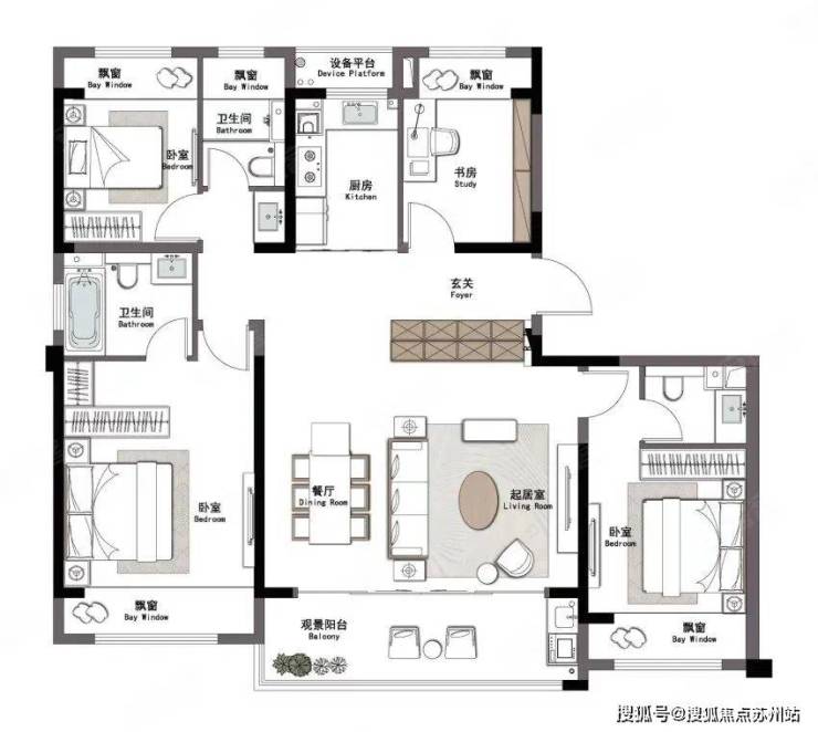 这一户型比较方正的3房2卫设计,南向客厅+餐厅的横厅设计,双卧朝南,整体设计也比较合理。两个房间也都做了飘窗,对室内空间有个延伸!