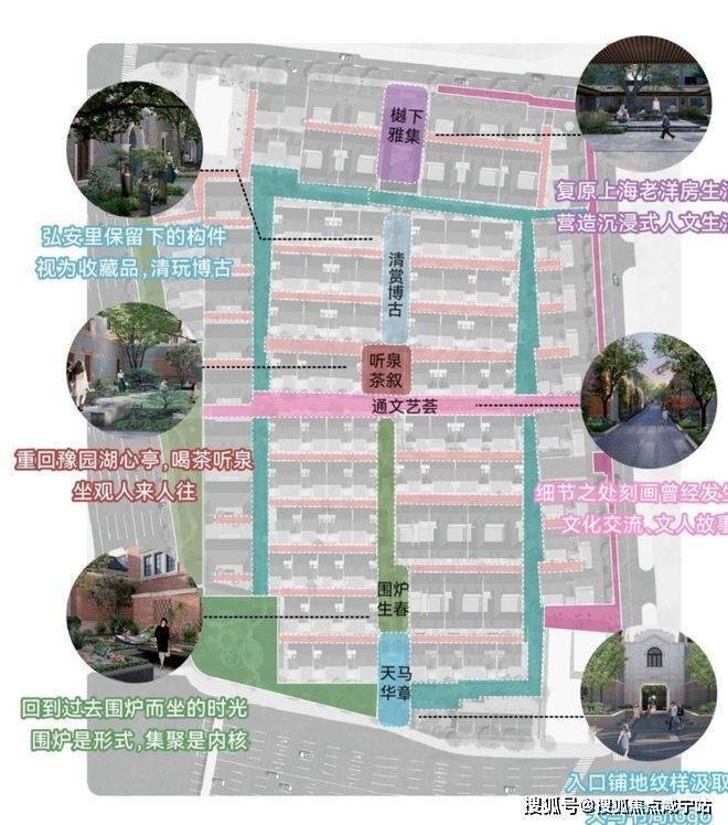 在社区的中轴上,弘安里植入记忆的符号与生活的画面,从入口处「天马华章」迈步前行,「围炉生春」「通文艺荟」「听泉茶叙」「清赏博古」贯穿到此次实景开放的「樾下雅集」,海派生活画卷昨日重现.