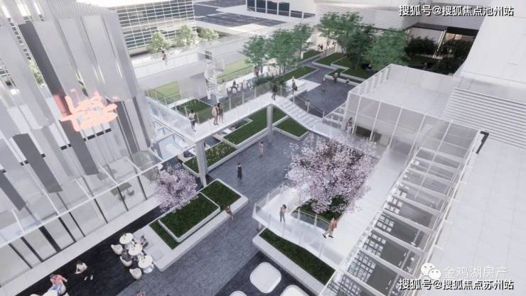 三座塔楼以植物为核心设计元素,在楼栋之间形成一整片绿色区域,呼应苏州当代城市肌理,将商业水岸、花园水岸、临街活力区和屋顶花园等绿意映衬在建筑设计之中,打造摩天大厦中的垂直花园。