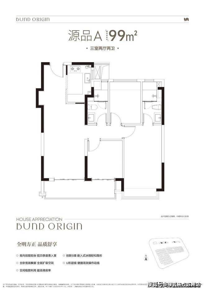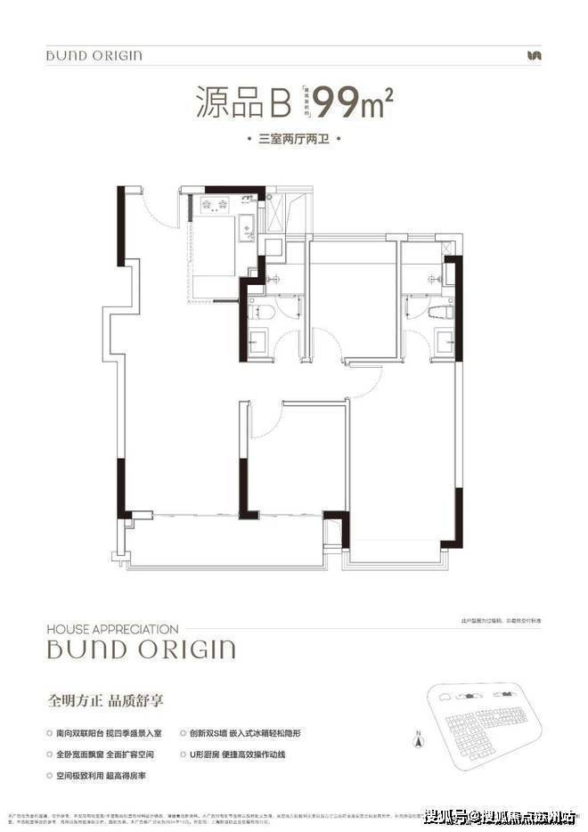 建面约99㎡3房2厅2卫,非常标准的动静分离、三开间朝南户型。