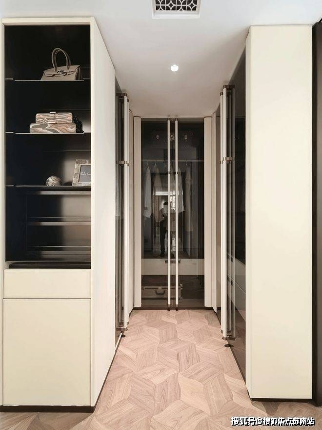 主卧和约99平户型一样,衣柜更大形成衣帽空间,还交付有半开放式、类似于酒店的迷你吧设计: