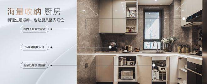 橱柜收纳系统:特别预置洗碗机点位、柜内下拉篮式设计、不锈钢挡油板、柜下操作灯、烹饪全流程功能动线一体化设计;