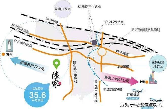 三块三横两纵,交通路网以及京沪高速陆家出口。