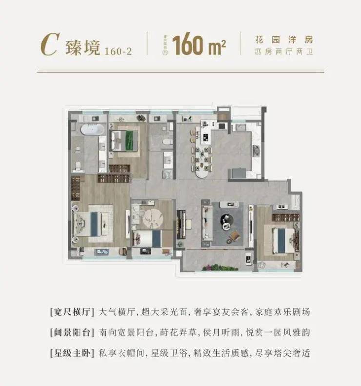 约160平方米的大宅,同样4开间朝南,更奢阔的空间,更自由的生活.动静分离,主卧更有步入式衣帽间,女主人的梦想都在这舒适的空间中一一实现,三卧朝南,北房间自由灵动,一间音乐室,或是图书室,也可以是书房、观影房……总之随心所欲.