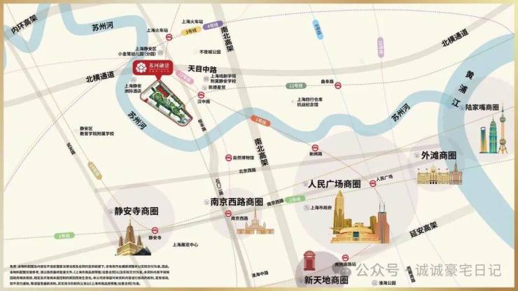 苏河融景整个小区由汉中路、长安路、普济路与恒丰路围合,临近汉中路地铁站和苏州河滨河景观带,生活配套便利,居住氛围闹中取静。
