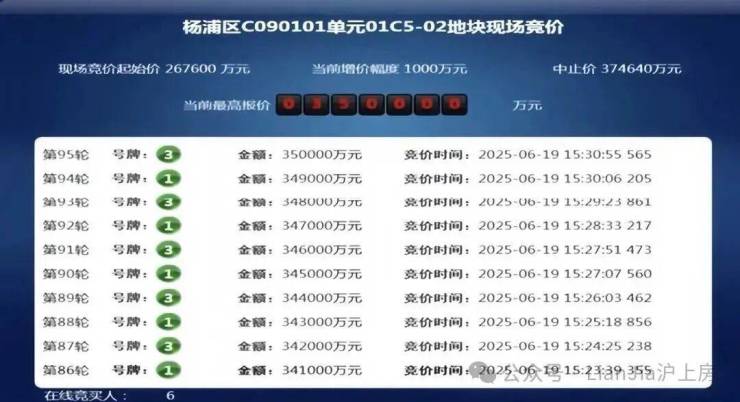 2025年6月上海5批次土拍中,6大国央企经过95轮激烈竞价