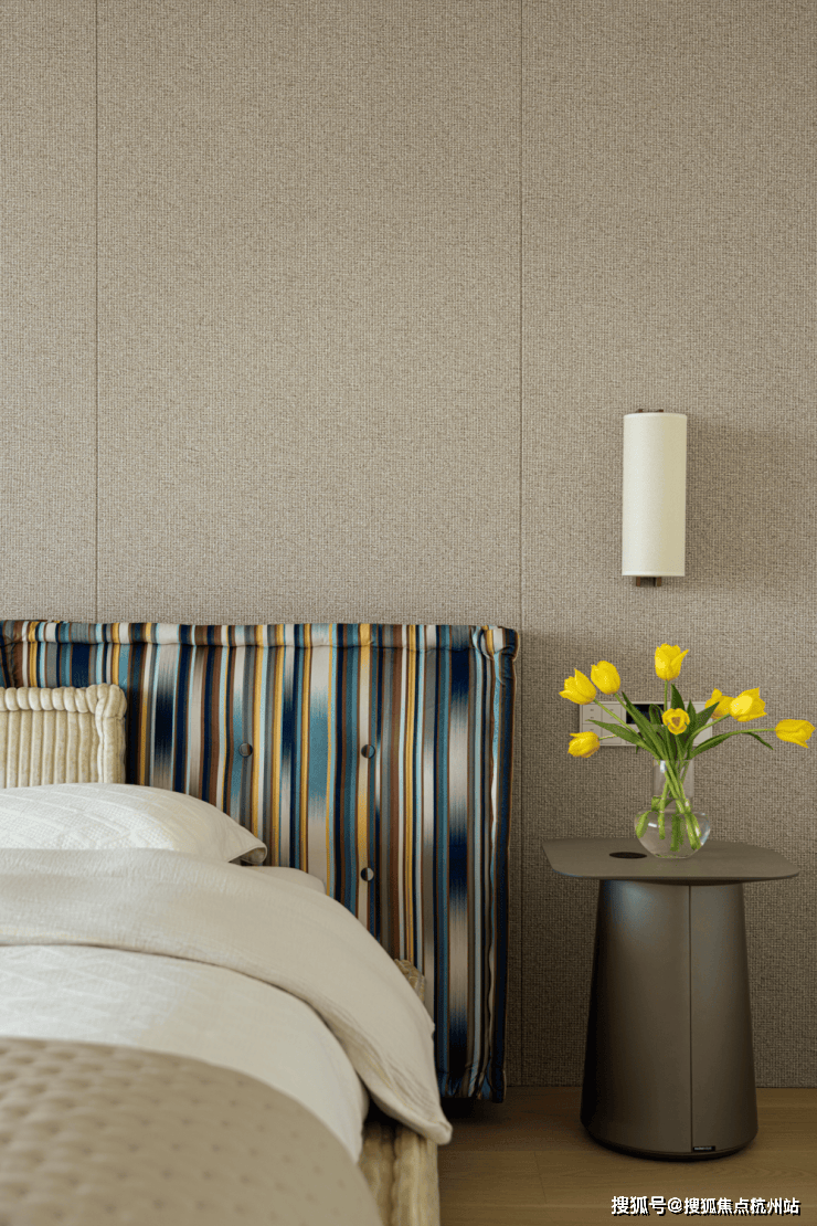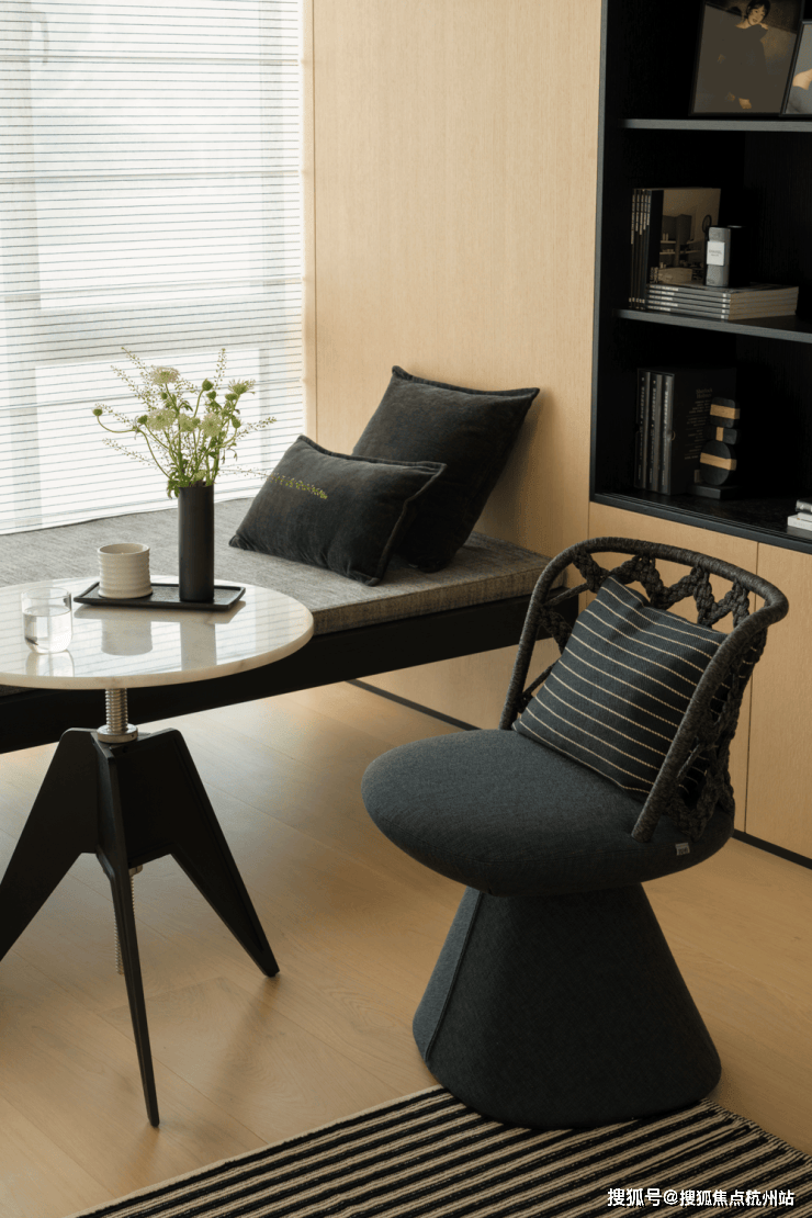 中央的B&BCamaleonda模块组合沙发,以岛状布局重构空间逻辑,双向陈设的低椅背设计。一面朝向书柜电视墙,一面衔接餐厨区。让场景切换随心意而生,既保持空间通透感,又以功能分区提升使用效率。