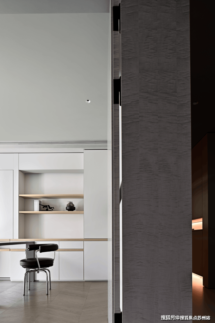 书房被藏在墙面的木色隐形门内,隐形门巧妙地在客厅与书房之间作了缓冲,避免白色“重叠”而造成疲劳感.