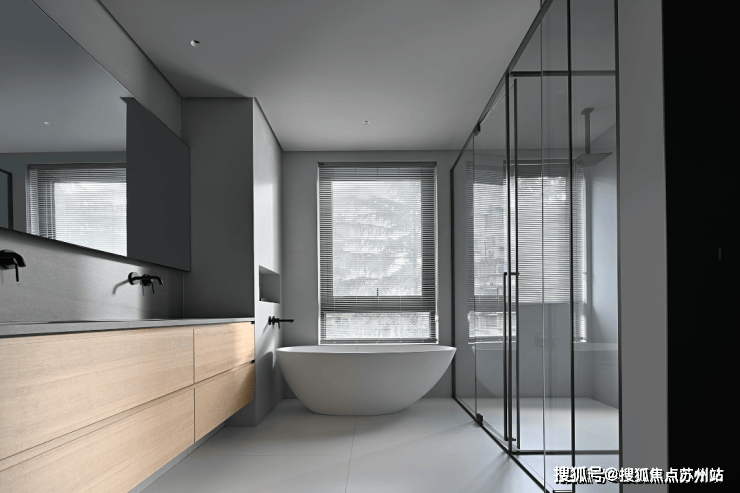 浴室贴心地做了三分离设计,完美践行了极简设计背后暗藏的功能主义.灰色与木色交融,创造出平和舒适的视觉体验.