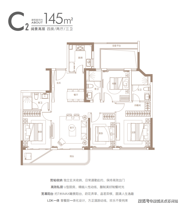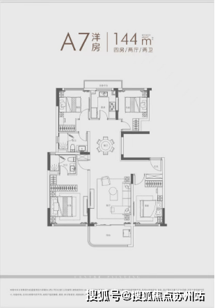 建面约140㎡四房:三开间朝南户型,南北通透,采光条件优质,客厅明亮宽敞,彰显大气布局。