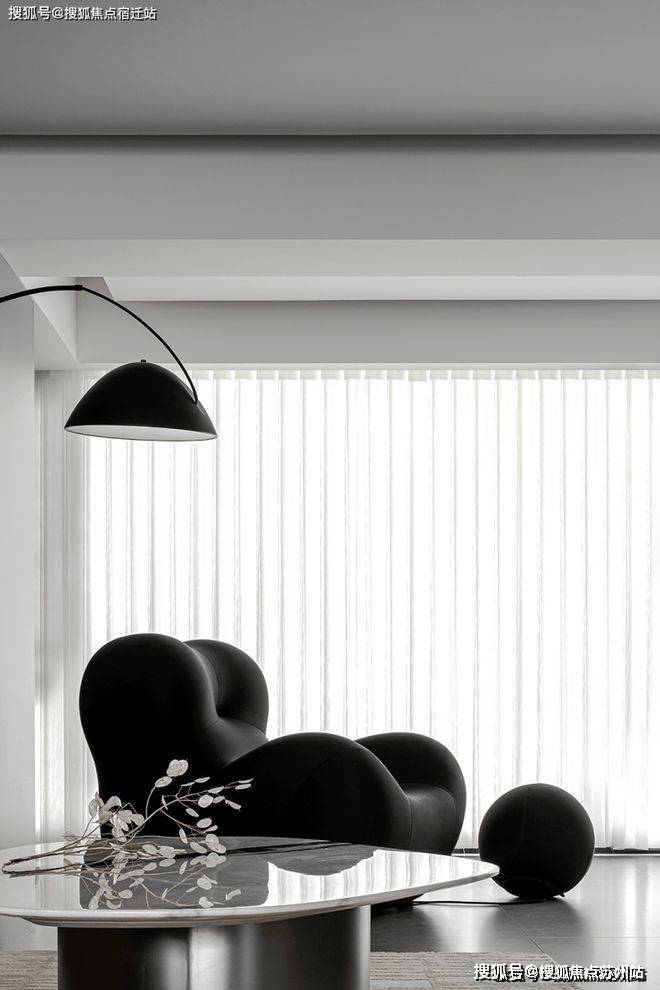 The open layout throughout the design has thrown away the shackles of traditional closure, so that each functional area naturally integrates with each other. Black shaped sofa like a dynamic melody, injected the vitality of the space, its many convex design, but also fit the body curve, for the residents to bring comfortable experience.