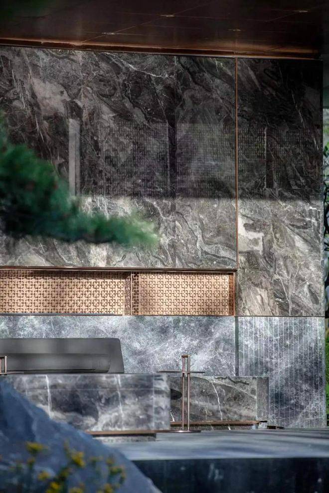 整座大堂墙面延续爱马仕灰大理石,顶部水晶灯和墙面壁灯均为全铜打造,大堂接待台采用产自意大利山脉的普拉达绿奢石一体打造而成。
