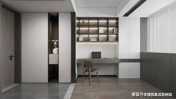 书房通过柜子与悬挑书桌连为一体,满足收纳的同时更有质感,开放柜暗藏灯带,夜晚看书办公的时候更有氛围