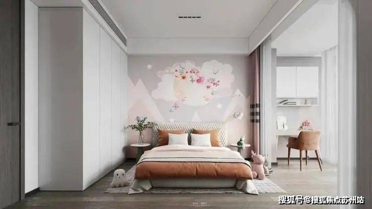 年纪稍大的女孩房间则用吊柜+书桌形式,更适合学习,同时粉色与橙色又让空间更显年轻