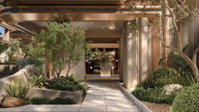 社区将通过入口大门、风雨连廊与架空层灰空间,形成层层递进的景观序列。光影透过廊架洒落,与两侧绿意交织,归家动线在遮蔽与开放之间自然过渡,使行走成为一段富有节奏的花园漫步,形成沉浸式的私密庭园,让归家成为游园体验。