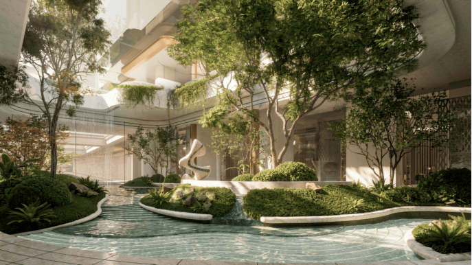 通过微地形、水景与植物层次的精心组合,让自然、艺术与生活相互融合,使居者在城市中感受到森林般的松弛与安宁。