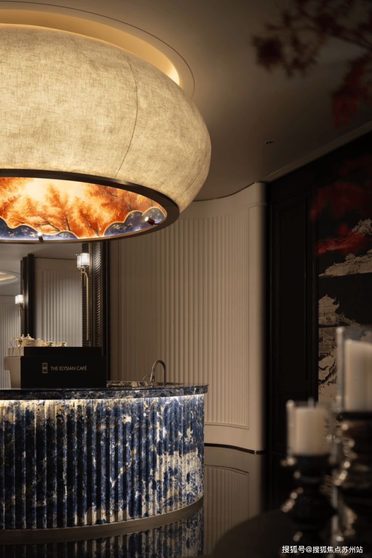 水吧頂面懸掛藝術家創作的"湖居新解"系列吊燈,如抽象的藝術畫,提供一種自然意趣,烘托著空間的藝術氣息。