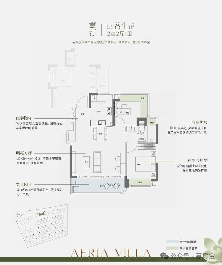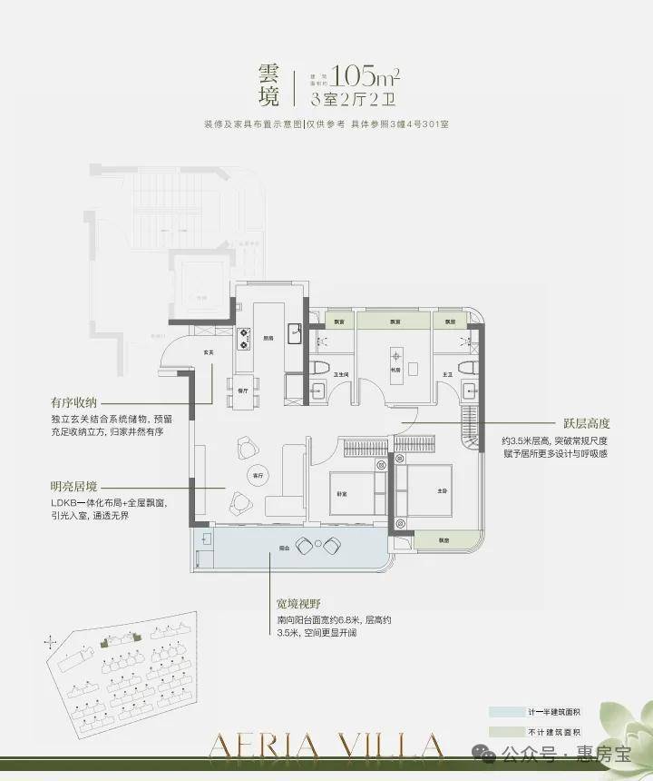 该户型附赠4个飘窗+3露台+1阳合½+挑空+闷顶等,实得率约135%!