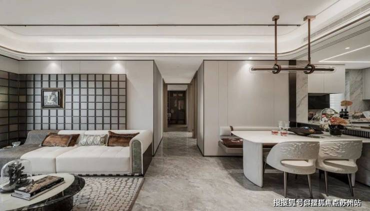 餐客厅踢脚线和厨房门框均为金属材质,开关面板全部定制同色系,把房屋美学做到极致……