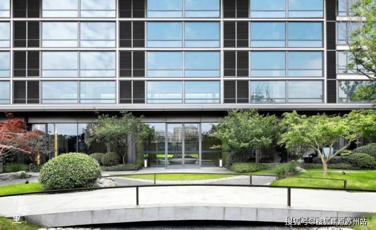 这个地上建筑面积约7万㎡的精装园区, 容积率低至约1.8。多层建筑以灰色铝板搭配石材及真石漆,藉由大尺度挑廊和风雨连廊,连缀出一个个口袋花园。