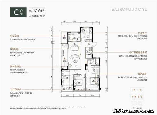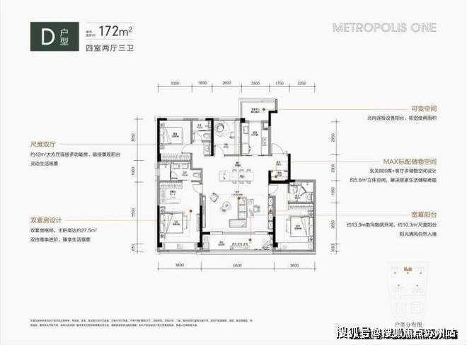 杭州珑望奥城售楼处电话☎:400-8828-814(预约看房热线)约172平方米的户型体现了生活的极致表达,其配备宽敞的大厅和跑道式阳台,四开间朝南和双套房的豪华设置使其在同类户型中突出。特别是厨房靠近客厅一侧的餐厅布局,使厨房成为家庭生活和社交的中心。