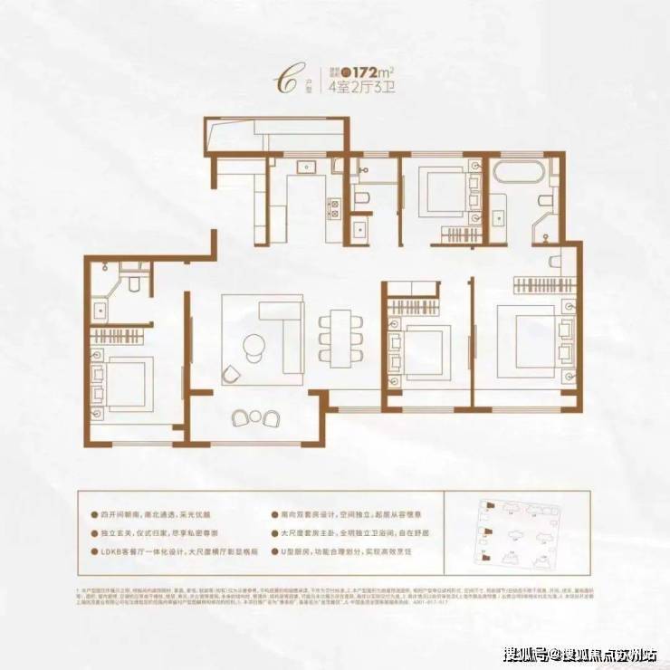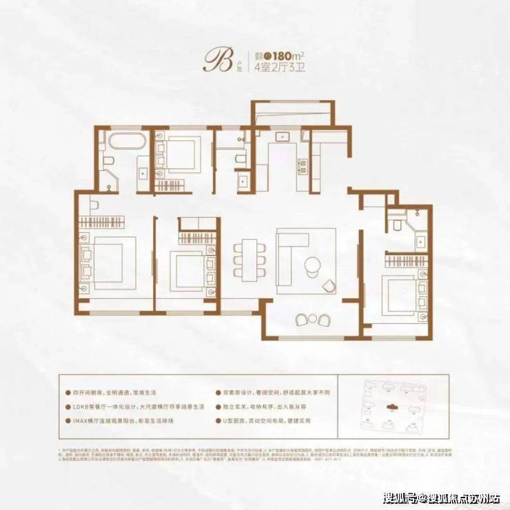 该户型集 LDBK一体化、玄关入户、动静分区设计、U型厨房、双卧飘窗、强大收纳等多重优势于一体,在功能性与舒适度上几乎都做到了极致!