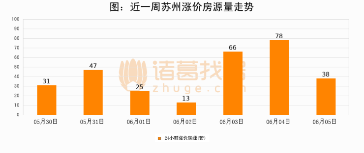 根据诸葛找房数据显示,苏州24小时涨价房源量为38套,较06月04日减少40套,环比下降51.3%。与此同时,涨价房源占比小幅回落,对于购房者来说是一个入市窗口期,购房者可抓住时机入市。