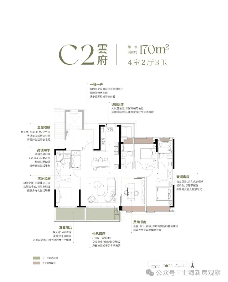 随后推出的 170㎡“悬浮全景舱”,直接引领上海高端户型革新—— 南向 15.8 米四面宽让每个空间都享阳光平权,深 U 型厨房预留西厨岛台,约8.35 米双阳台兼顾功能与情绪价值,双套房 + 270° 全景窗 + 三卫设计,更将 “新平权主义” 落到实处,让每位家庭成员都有私密空间;