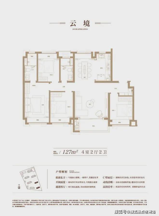 建筑约127㎡的「云境」空间内,四开间南向结合舒朗的方厅,大尺度的面宽让光赋予了生活更多的灵感.厨房U形台面,尽情挥洒味觉灵感,一体化的客餐厅创造更丰富的用餐、社交场景,从西式brunch到日式omakase,尽享味蕾的欢愉时光.一梯两户的入户,搭配轩朗的玄关,让每一次归家,都更从容......