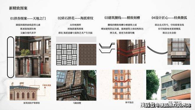 复刻马勒别墅的海派席纹砖石拼花,雕琢顶豪别墅的气场。天地之门拱券图案、精致刻槽建筑腰线、邬达克式经典微弧,勾勒风貌别墅的新精致主义格调。