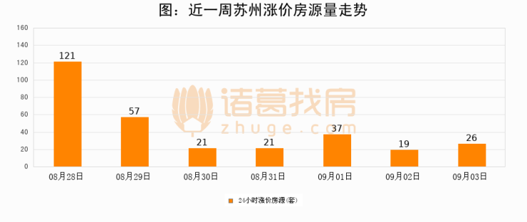 根据诸葛找房数据显示,苏州24小时涨价房源量为26套,较09月02日增加7套,环比上涨36.8%。与此同时,涨价房源占比小幅扩大,业主信心有所提升。