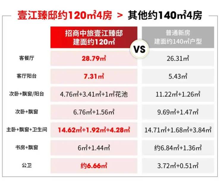 在与建面约140㎡左右的大4房的对比中,壹江臻邸客餐厅、客厅阳台、主卧、公卫的空间都更大。