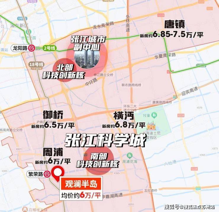 以张江为中心,科学城范围内各板块房价格局。红线范围内唐镇、橫沔、御桥百平米3房总价都在650-700万级。观澜半岛同样是总价600万级买到张江科学城红线范围内地铁房的天赐良机!