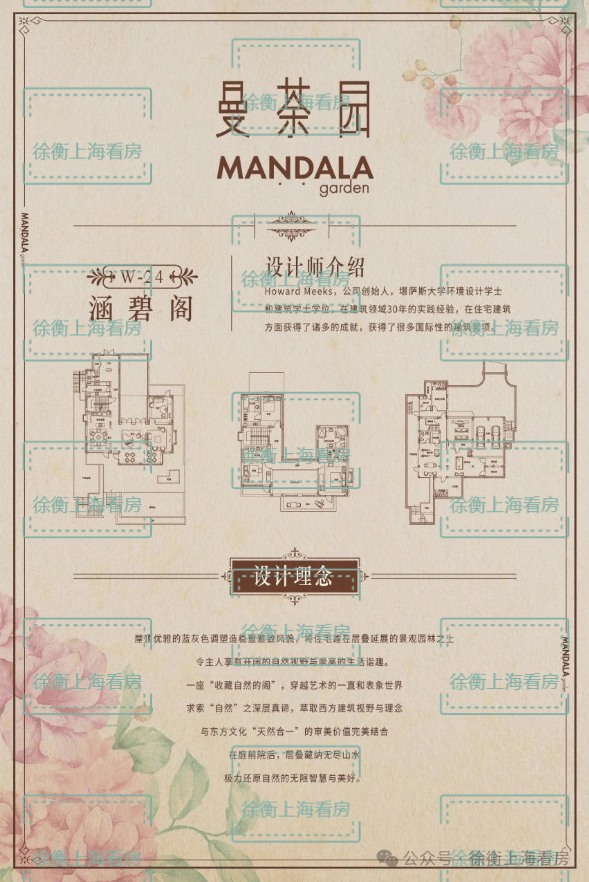 如今呈现在你眼前的曼荼园,由79幢别墅、2幢商务别墅构成,建筑面积约61715平方米,积率仅为0.2。100%原创,历时8载,设计费用达1.5亿,从设计到建造的过程,每一步都精雕细刻,每一个元素都讲究原创性和唯一性,更有建筑外观专利保证;81件人居艺术藏品,谨献81位贵胄人士品鉴。如今,大器始成。81栋有生命力的可居住的艺术品、81朵艺术人居之花于佘山脚下绽放。81种风格如81页风景,各领风骚于枝头。