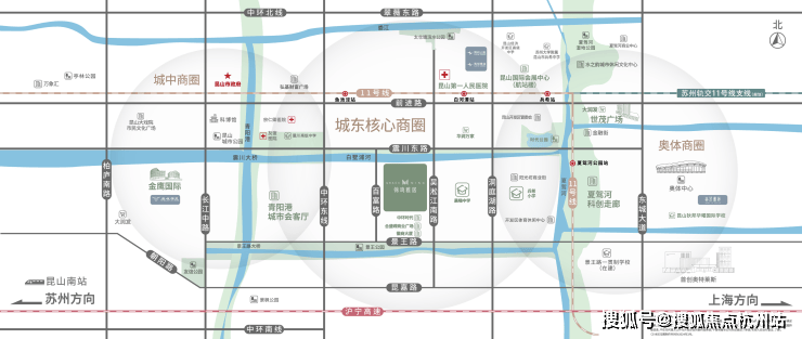 自驾网络 :项目紧邻 娄东路、吴淞江路、前进东路、中环东线 等城市主干道,驾车至昆山市中心约 15分钟 ,至苏州工业园区约 25分钟 ,通过沪宁高速可快速接入长三角高速路网,通勤效率在城东板块位居前列。