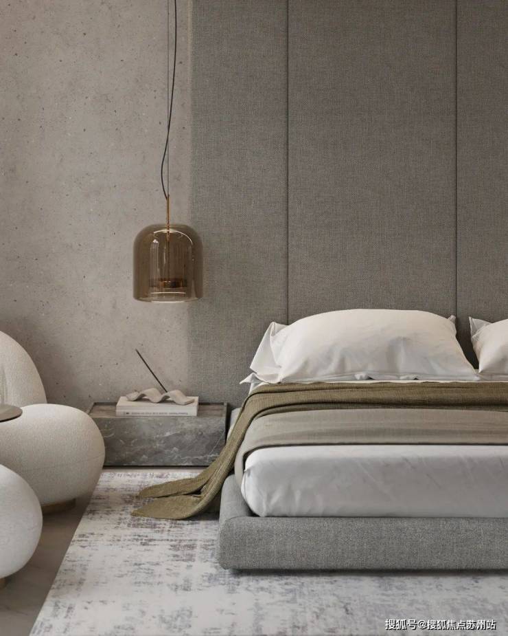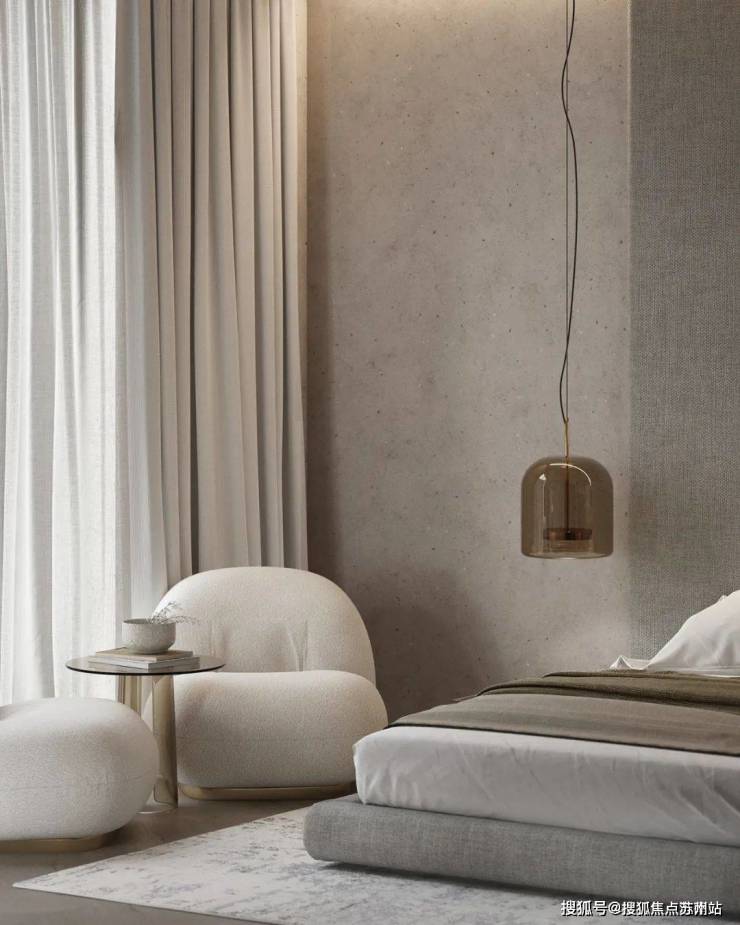 卧室中灰色的主色调与客厅相呼应,柔软蓬松的白色床品为屋主打造出了一个温馨舒适的休憩空间,床头柜选用灰色大理石,上方的床头灯则是金属与玻璃,不同材质的搭配让空间显得更加精致,富有美感。落地窗前的小沙发与茶几,能够让屋主在这度过舒适的下午茶时光。