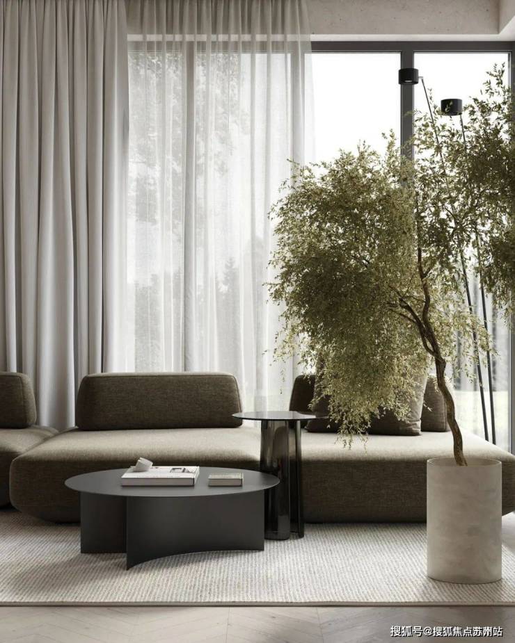 客厅中,设计师选用暖灰色作为空间的主色调,搭配上原木色的地板,奠定现代极简的空间基调。灰绿色的布艺沙发搭配上圆形的小茶几,展现出空间的几何美感。沙发旁摆放着绿植,为室内空间增添了一抹色彩,呈现出现代空间的生活美学。