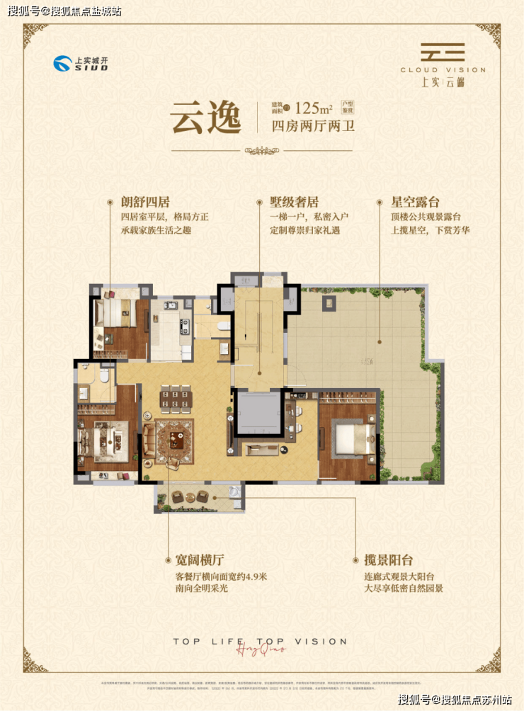 户型点评:建面约125㎡4房2厅2卫,一梯一户设计,专属入户空间。该户型做到了四开间朝南+主卧套房设计+卫生间干湿分离,超大南向采光面,室内通透明亮;客餐厅相连,约4.9米大面宽横厅,客厅南连观景大阳台,会客区空间宽奢、大气;主卧套房设计,带独立卫生间和飘窗,专属于主人的私密空间;该户型享受了墅居体验,是三代同堂优质户型之选。