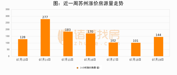 根据诸葛找房数据显示,苏州24小时涨价房源量为144套,较07月18日增加43套,环比上涨42.6%。与此同时,涨价房源占比小幅扩大,业主信心有所提升。
