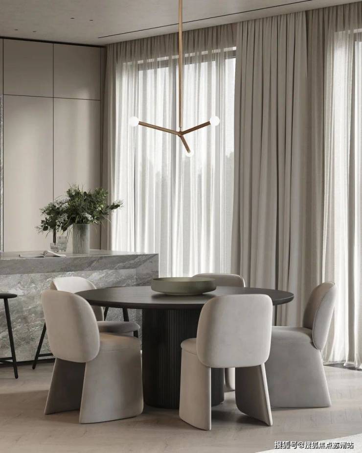 餐厅与厨房位于客厅的旁边,开放式的设计很好地利用了不大的公共空间,给人开阔的视觉感受。光线透过落地窗照入室内,让空间更加明亮。木质的圆形餐桌搭配上上方的金属吊灯,显得柔和而有质感。中岛台选用灰色大理石材质,与整体空间完美融合。
