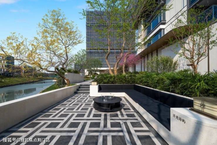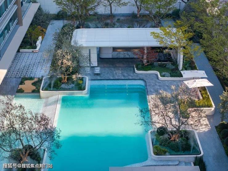 很多楼盘水池铺的都是瓷砖马赛克, 但它却用上了意大利卡拉卡白大理石,将池水衬出梦幻的蒂芙尼蓝。池边摇曳着油橄榄树、造型紫薇,高级感丝毫不逊现在那几个网红豪宅。